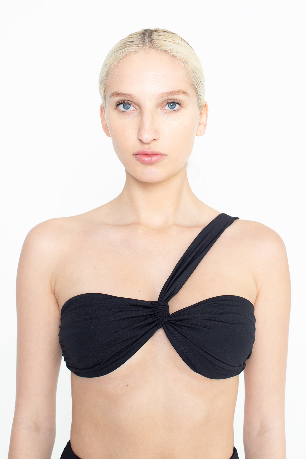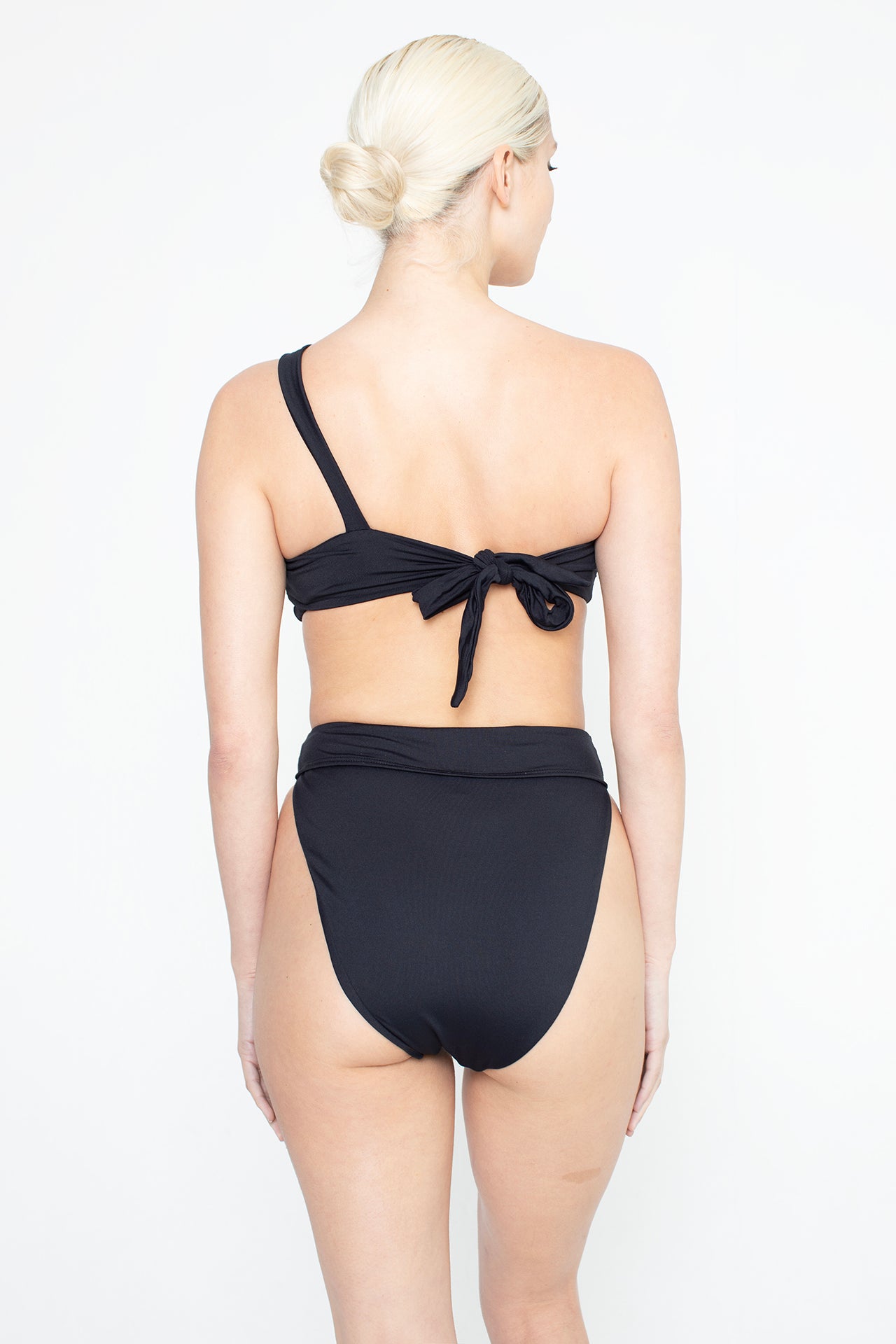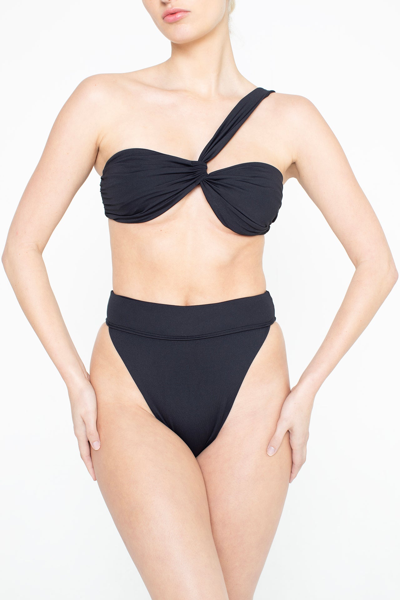 The Hermosa swimsuit is a striking one-shoulder two-piece featuring a twisted bandeau top and high-waisted, high-cut bottoms for a sculpted, confident look.